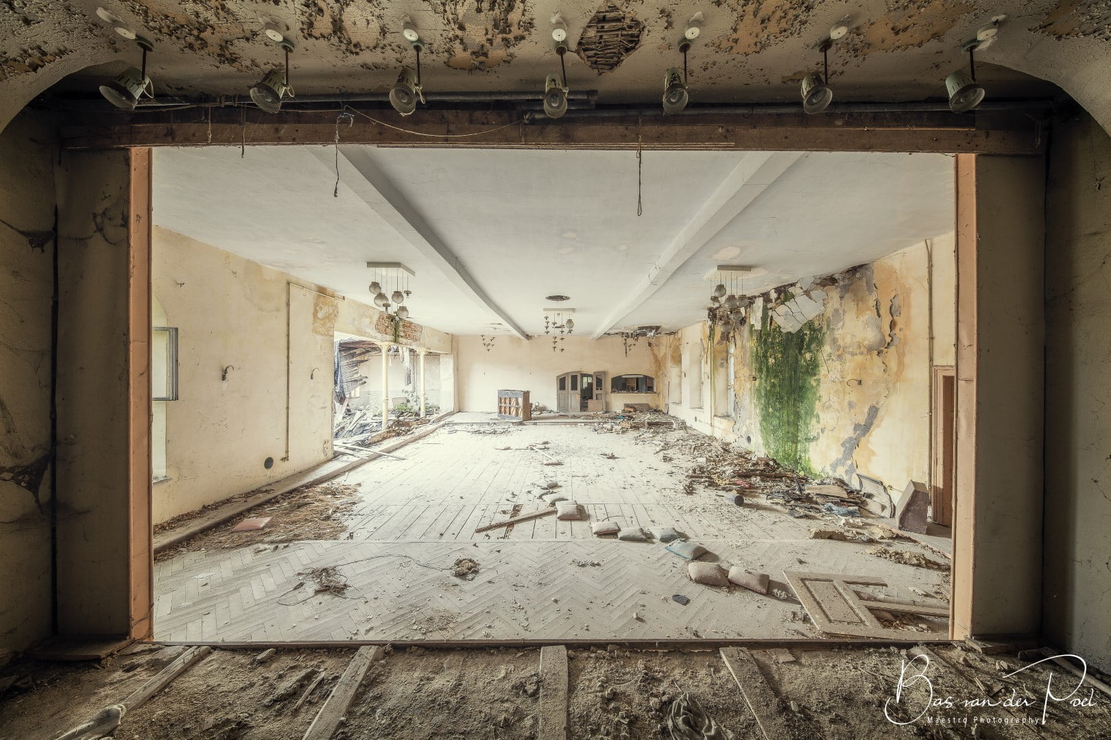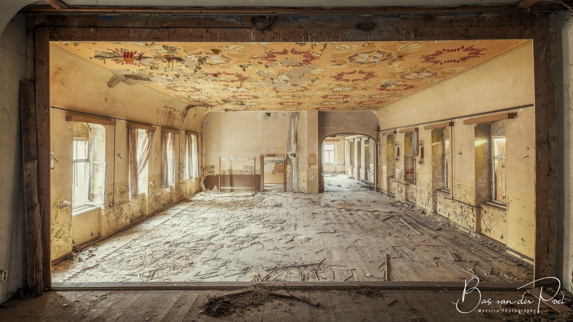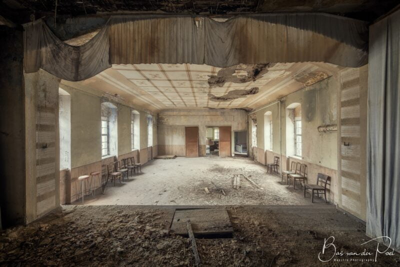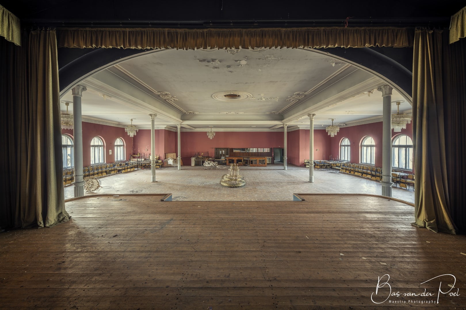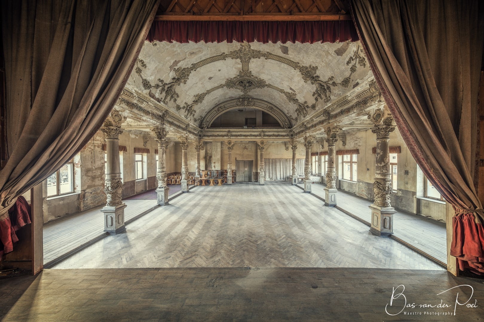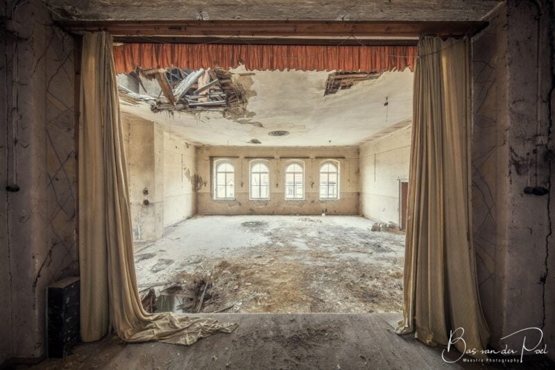In my travels, I came across a number of abandoned ballrooms in former East Germany. What attracted me was their romantic atmosphere and faded beauty. From the stage, you can almost reach out and touch the romance. This led me to choose a uniform perspective throughout the series. Always from the stage into the room. This proved more dangerous than it sounds. The stage areas were often unstable, sometimes covered in collapsed roofing, or destroyed entirely. Still, I stuck to my vision.