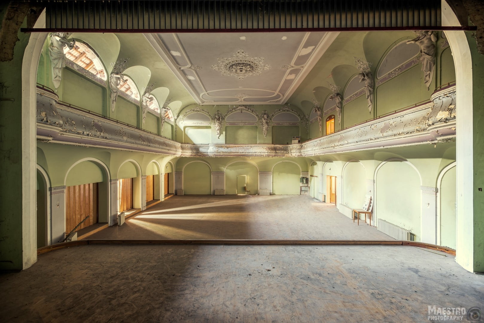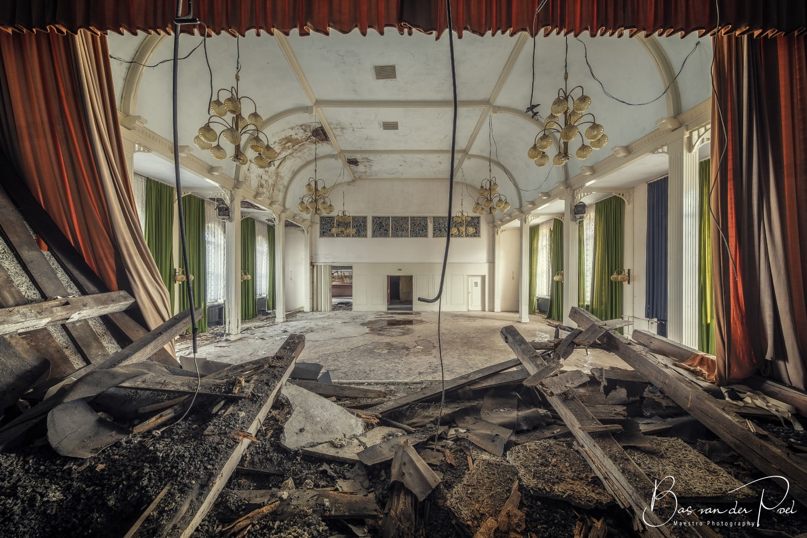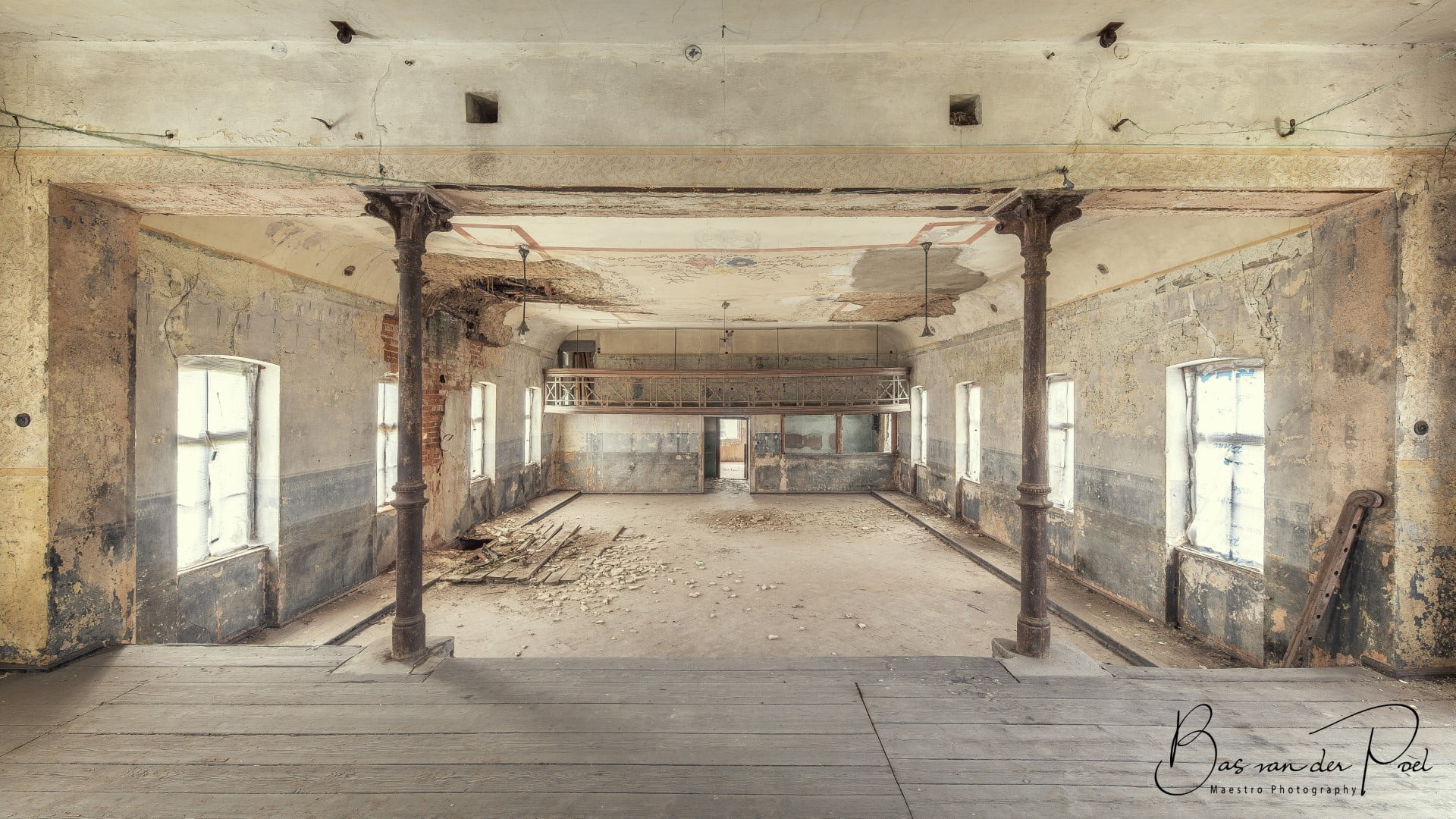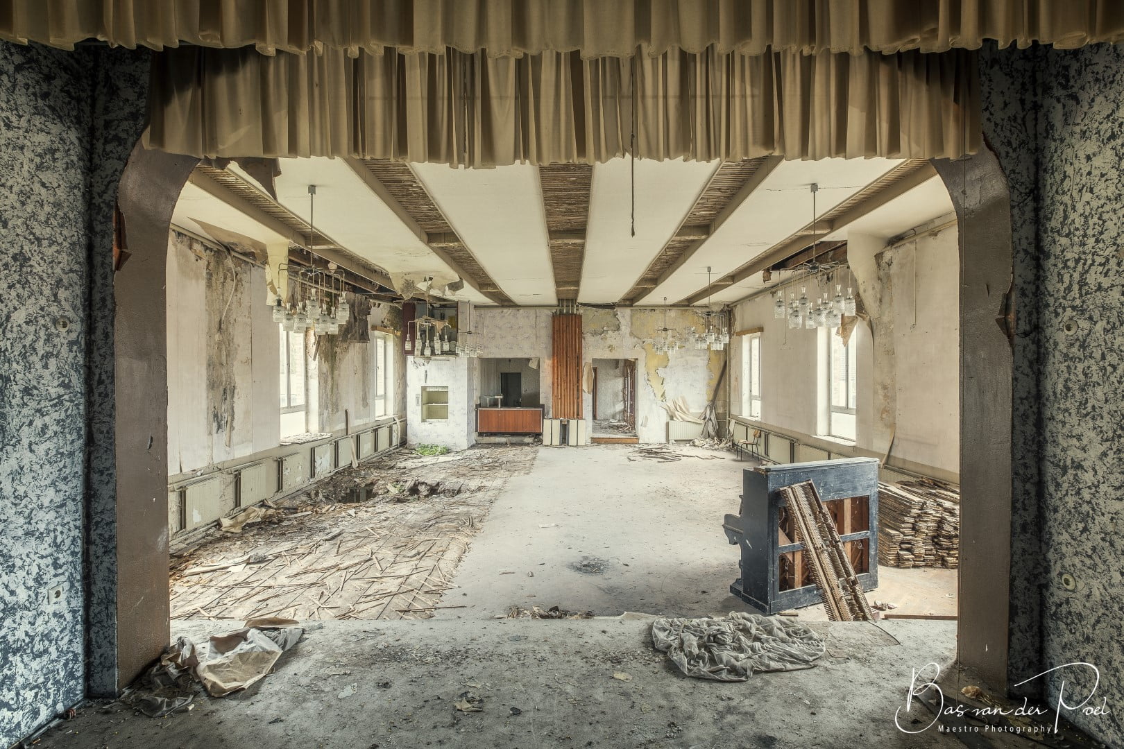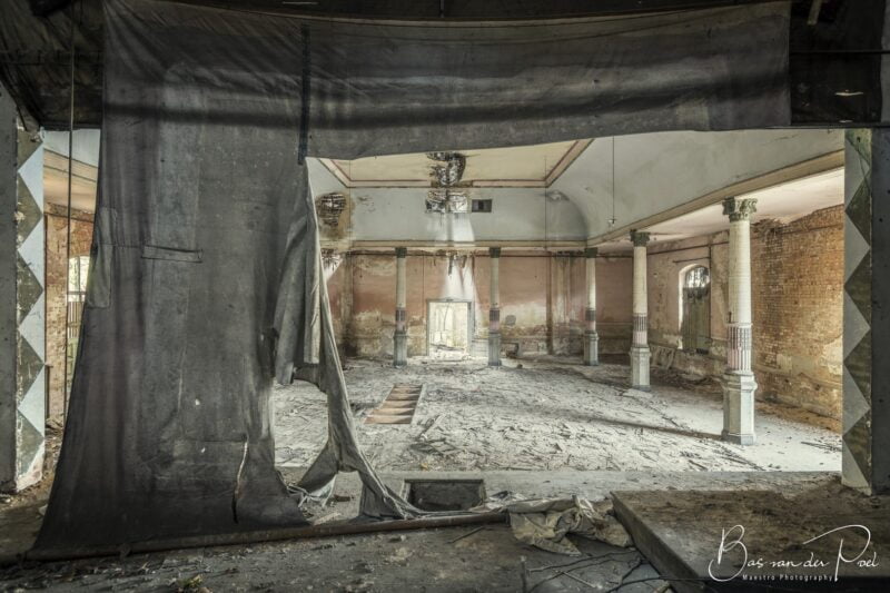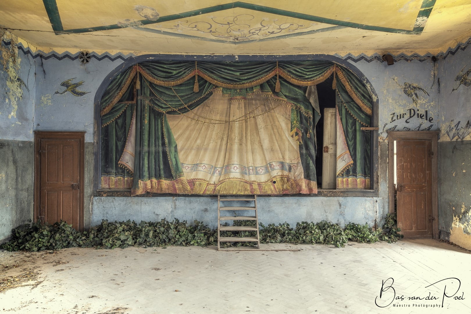 In my travels, I came across a number of abandoned ballrooms in former East Germany. What attracted me was their romantic atmosphere and faded beauty. From the stage, you can almost reach out and touch the romance. This led me to choose a uniform perspective throughout the series. Always from the stage into the room. This proved more dangerous than it sounds. The stage areas were often unstable, sometimes covered in collapsed roofing, or destroyed entirely. Still, I stuck to my vision.
