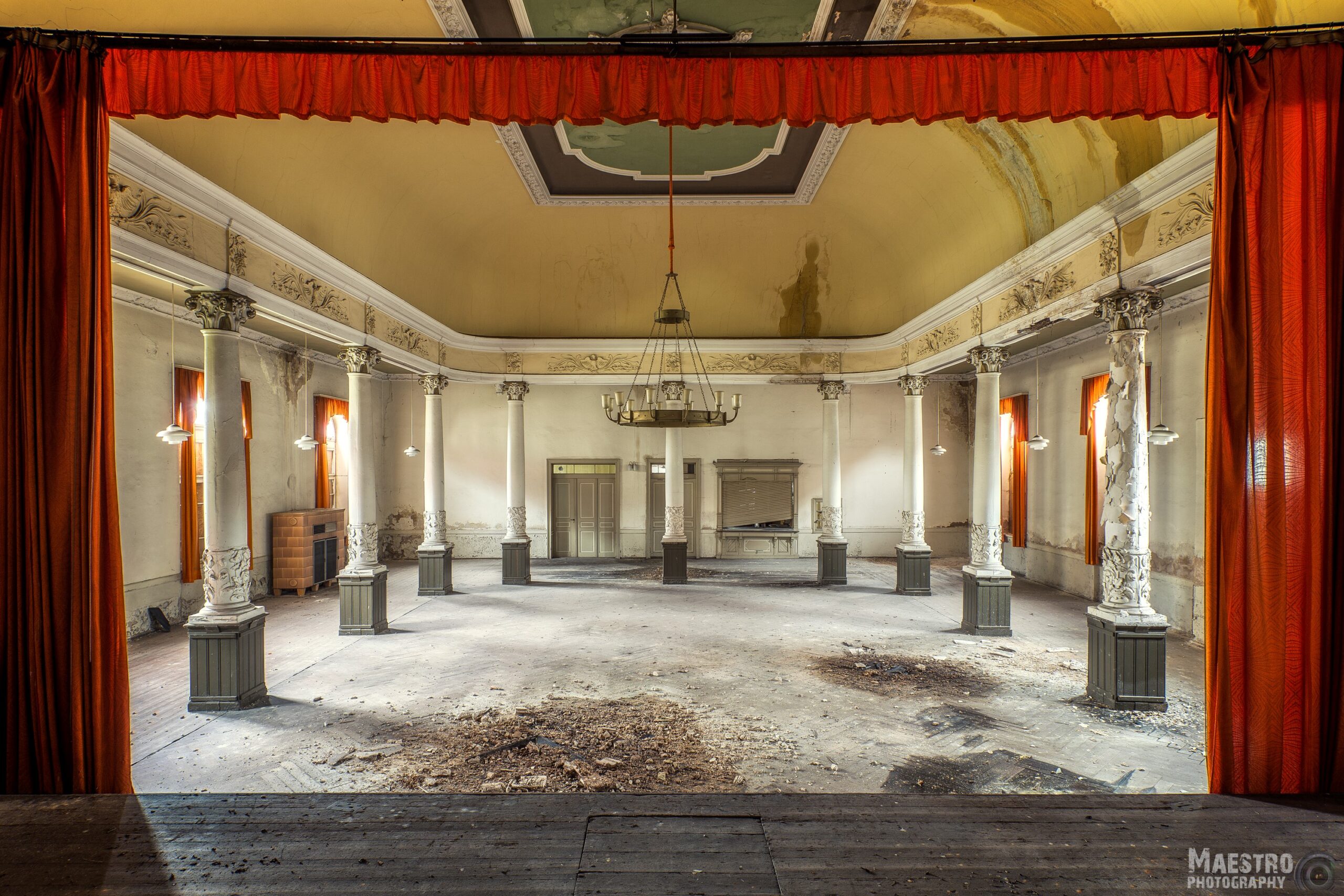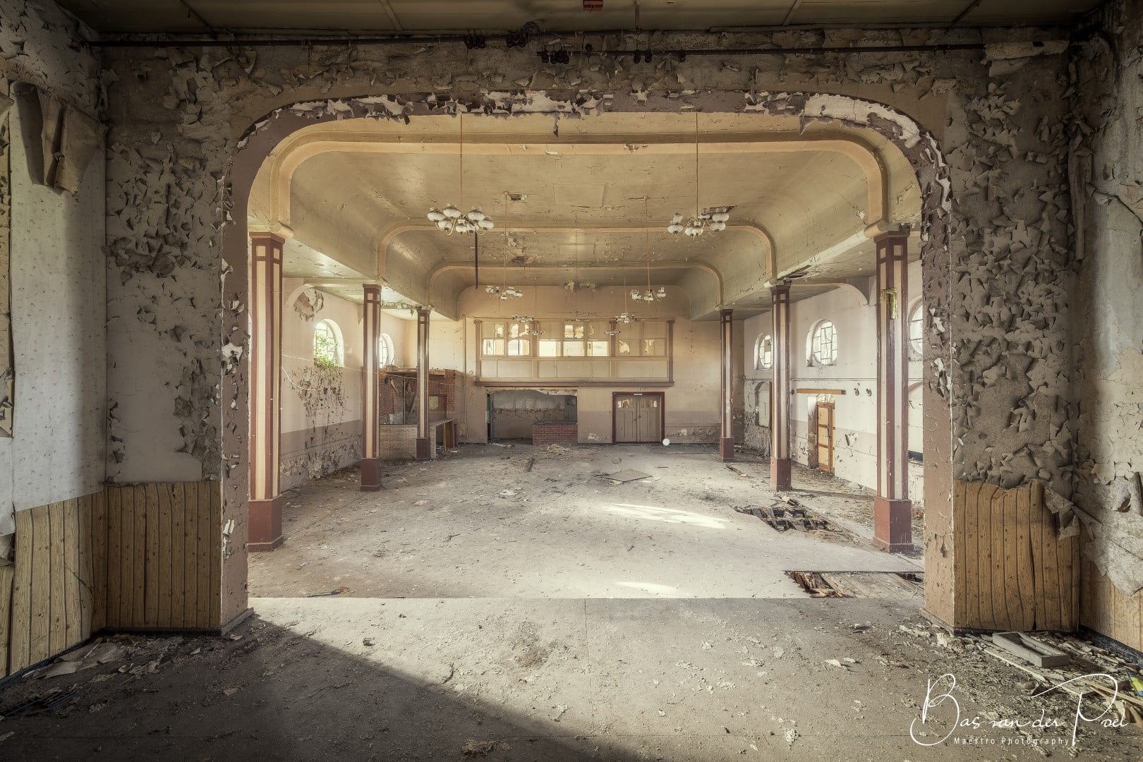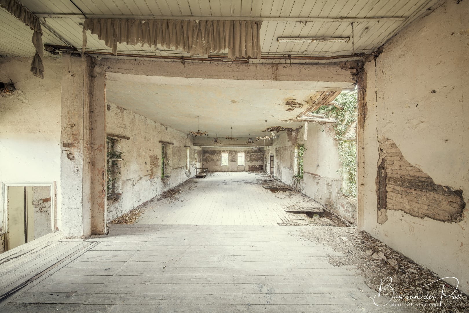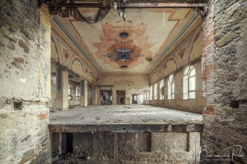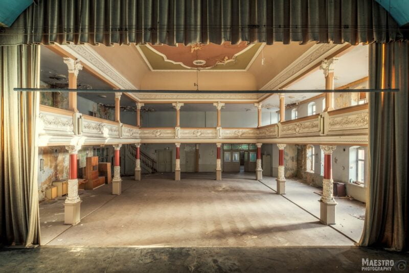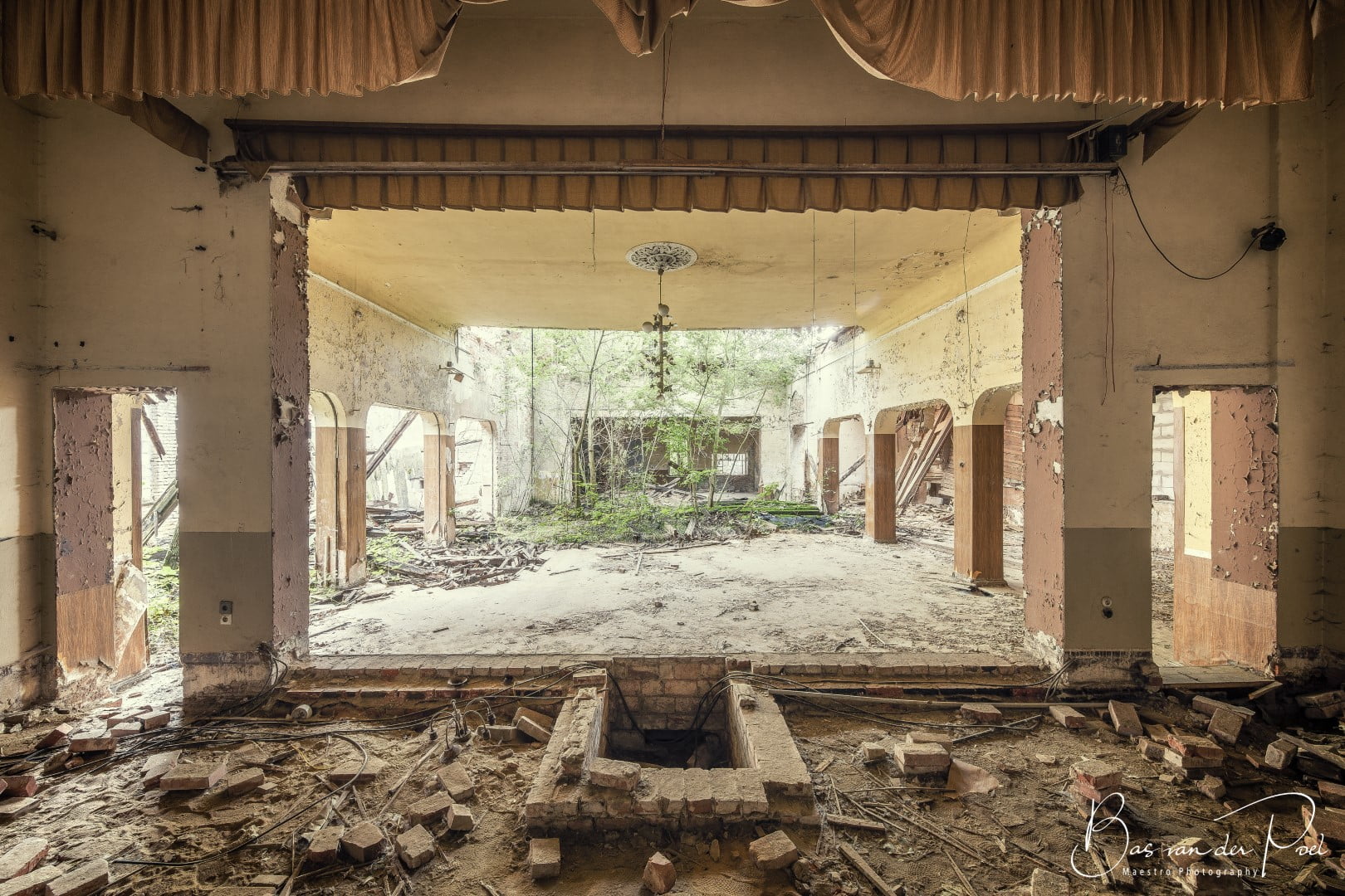 In my travels, I came across a number of abandoned ballrooms in former East Germany. What attracted me was their romantic atmosphere and faded beauty. From the stage, you can almost reach out and touch the romance. This led me to choose a uniform perspective throughout the series. Always from the stage into the room. This proved more dangerous than it sounds. The stage areas were often unstable, sometimes covered in collapsed roofing, or destroyed entirely. Still, I stuck to my vision.