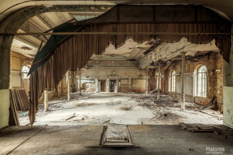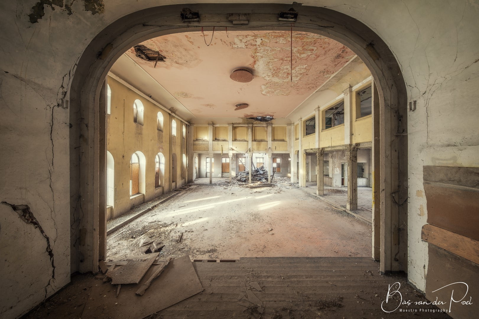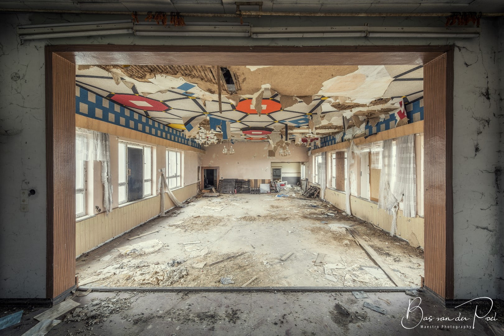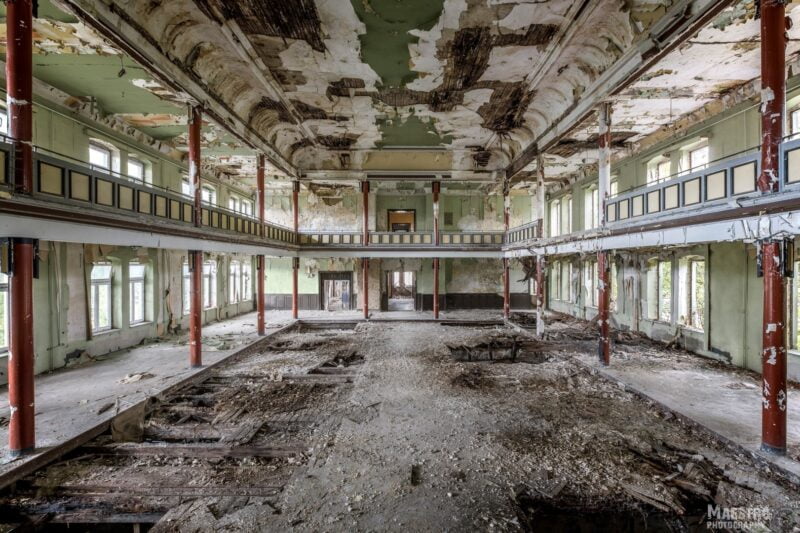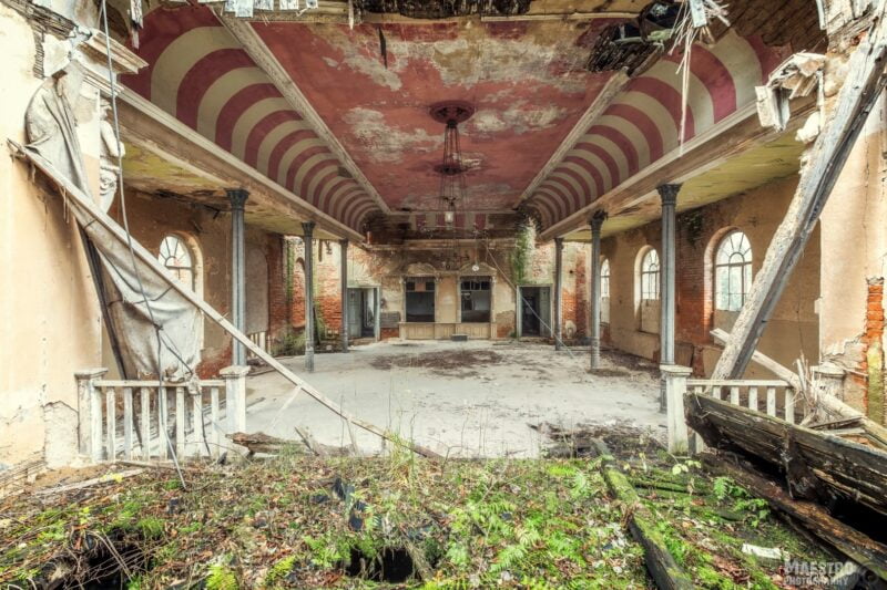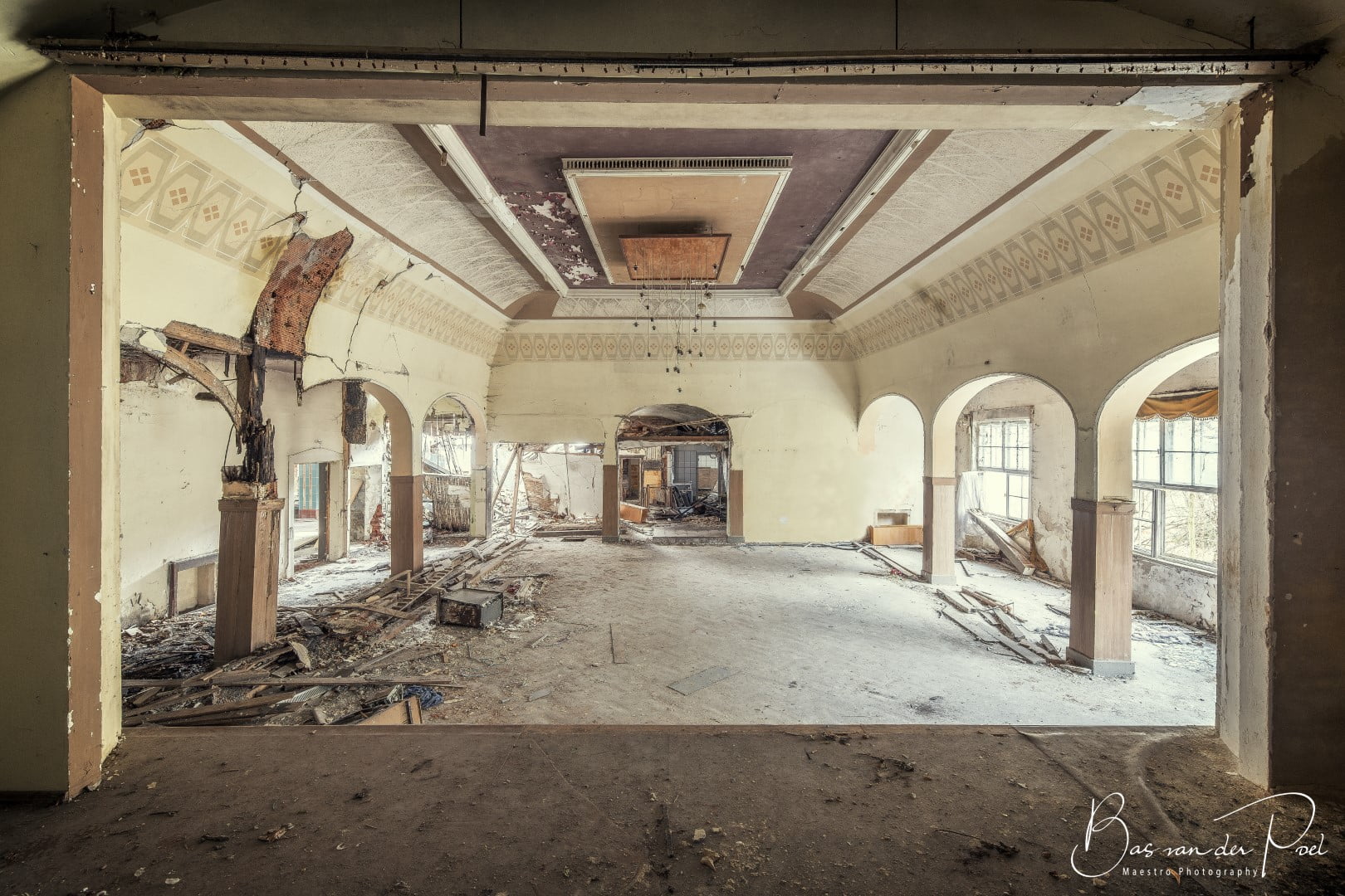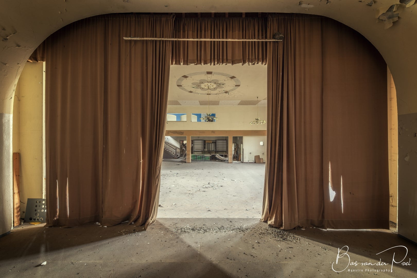In my travels, I came across a number of abandoned ballrooms in former East Germany. What attracted me was their romantic atmosphere and faded beauty. From the stage, you can almost reach out and touch the romance. This led me to choose a uniform perspective throughout the series. Always from the stage into the room. This proved more dangerous than it sounds. The stage areas were often unstable, sometimes covered in collapsed roofing, or destroyed entirely. Still, I stuck to my vision.